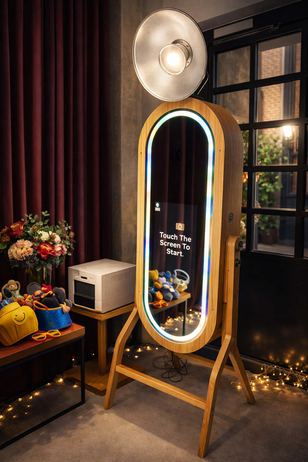 Unser stilvoller Vintage Fotospiegel ist ein echter Blickfang und sorgt für besondere Momente auf jeder Hochzeit und jedem Event. Einfach zu bedienen, interaktiv und mit Sofortdruck entstehen hochwertige Erinnerungen, die eure Gäste begeistern und mit nach Hause nehmen können.